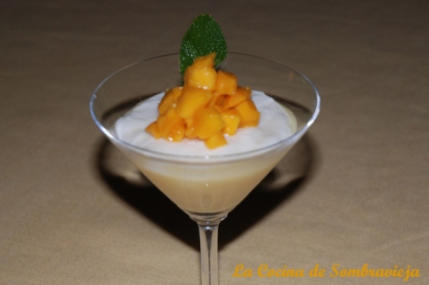 Finalmente, pelar el mango, cortarlo en macedonia pequeña y coronar la copa con él. Rociar un poco de ralladura de limón y decorar con la hoja de menta.