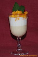 Finalmente, pelar el mango, cortarlo en macedonia pequeña y coronar la copa con él. Rociar un poco de ralladura de limón y decorar con la hoja de menta.