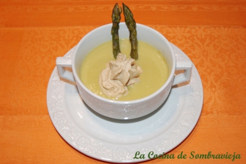 Servir la crema caliente en pequeños bols individuales, acompañada de un par de puntas de espárrago y verter sobre ella la emulsión con el sifón, previamente templada al baño maría para que su salida fluya mejor.