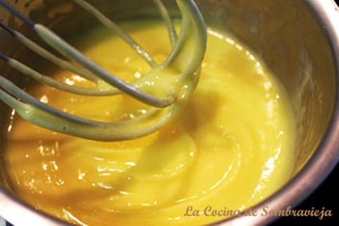 Aparte, batir enérgicamente las yemas con el azúcar y añadirles(1) la leche apartada, agitando rápidamente para que las yemas no cuajen. Seguir a fuego lento mientras se espesa la crema pastelera. Retirar del fuego.