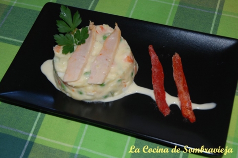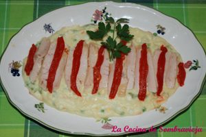 Por otra parte, preparar la mayonesa ligera (300 cc de aceite por 2 huevos) y verter sobre la mezcla. Remover bien para que quede bien repartida y el conjunto jugoso.