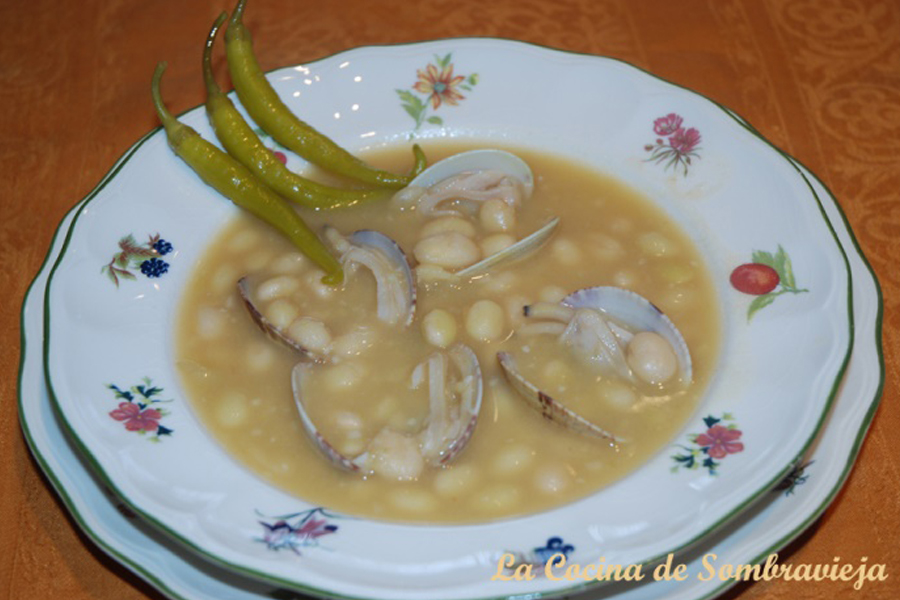 Finalmente, llevar a fuego una sartén con un poco de aceite y el ajo picado. Cuando éste empiece a bailar añadir un chorro de vino y dejar un minuto para que evapore el alcohol. Echar las almejas y tapar unos dos minutos hasta que se abran. Retirar del fuego y verter todo sobre el guiso, meneando un poco para que se integre con las pochas. Rectificar de sal. Servir, acompañando opcionalmente con piparras.