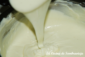 Añadir la leche muy caliente, en chorrito fino, y seguir mezclando. Batir con varilla hasta obtener una textura suave, brillante y muy cremosa. Esta operación puede prolongarse durante más de 20 min. Otra opción es realizarla con varilla eléctrica.