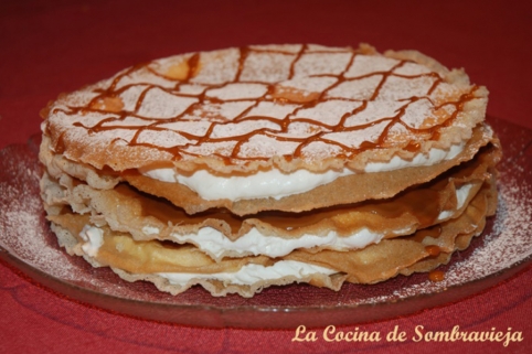 Montar la tarta en el último momento, dosificando el dulce de leche* y la nata montada con sendas mangas pasteleras u otro procedimiento, alternando el relleno en círculos concéntricos por cada oblea. Se puede decorar la cara visible de la última.