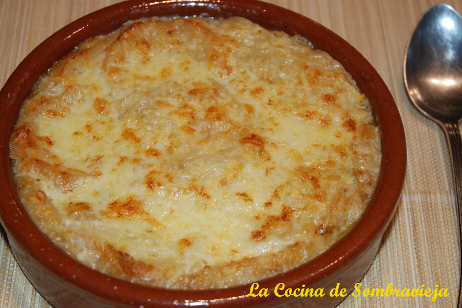 Una vez cocida la sopa –opcionalmente se puede tamizar por el chino o por el pasapurés, retirando el bouquet garni- rectificar la sazón y volcarla sobre la cazuela de barro, repartiendo por toda la superficie el resto del queso. Gratinar en el horno unos minutos. Servir enseguida.