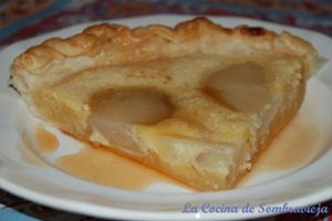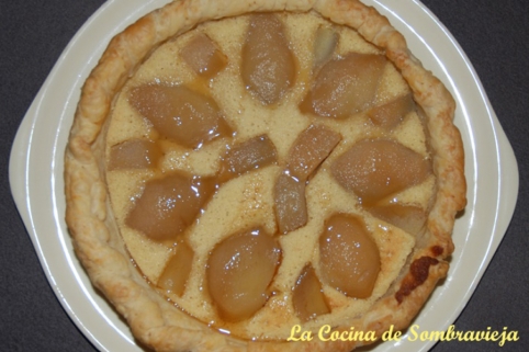 Rellenar la tartaleta con la crema y disponer encima las peras laminadas más o menos gruesas, acaballadas o distribuidas de modo casual.