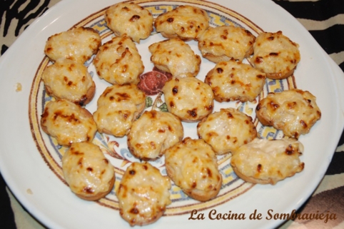 Aplicar con cuchara sobre las tostadas haciendo un montoncito, distribuir en placa de horno y gratinar sin arrimar mucho al grill hasta que se doren.